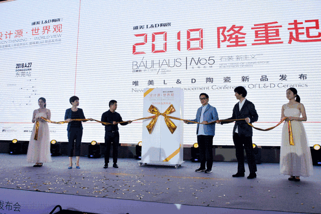 之后的新品揭幕儀式,由梁志天先生、琚賓先生、唯美L&D陶瓷事業部總經理蘭盛標先生及唯美L&D陶瓷東莞分公司副總經理黎苑女士共同為唯美L&D陶瓷2018年度新品揭幕。